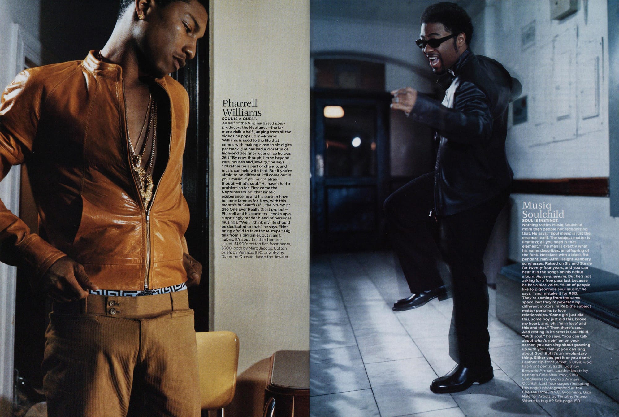 He hasn’t had a problem so far. First came the Neptunes sound—that kinetic exuberance he and his partner became famous for. Now, with this month’s In Search Of…, the NERD (No One Ever Really Dies) project, Pharrell and his partners cook up a surprisingly tender blend of personal musings.