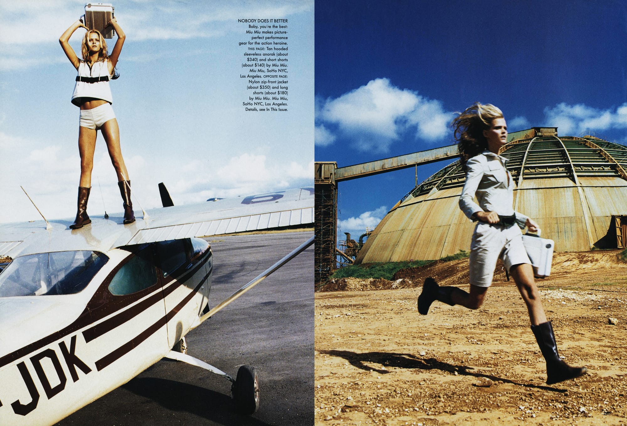 NOBODY DOES IT BETTER - Baby, you're the best: Miu Miu makes picture-perfect performance gear for the action heroine. THIS PAGE: Tan hooded sleeveless anorak (about $340) and short shorts (about $140) by Miu Miu. Miu Miu, SoHo NYC, Los Angeles. OPPOSITE PAGE: Nylon zip-front jacket (about $350) and long shorts (about $180) by Miu Miu. Miu Miu, SoHo NYC, Los Angeles.