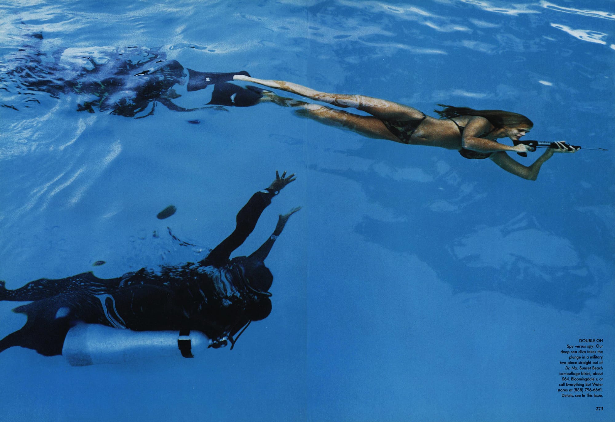 DOUBLE OH - Spy versus spy: Our deep-sea diva takes the plunge in a military two-piece straight out of Dr. No. Sunset Beach camouflage bikini, about $64. Bloomingdale's; or call Everything But Water stores at (888) 796-6661.