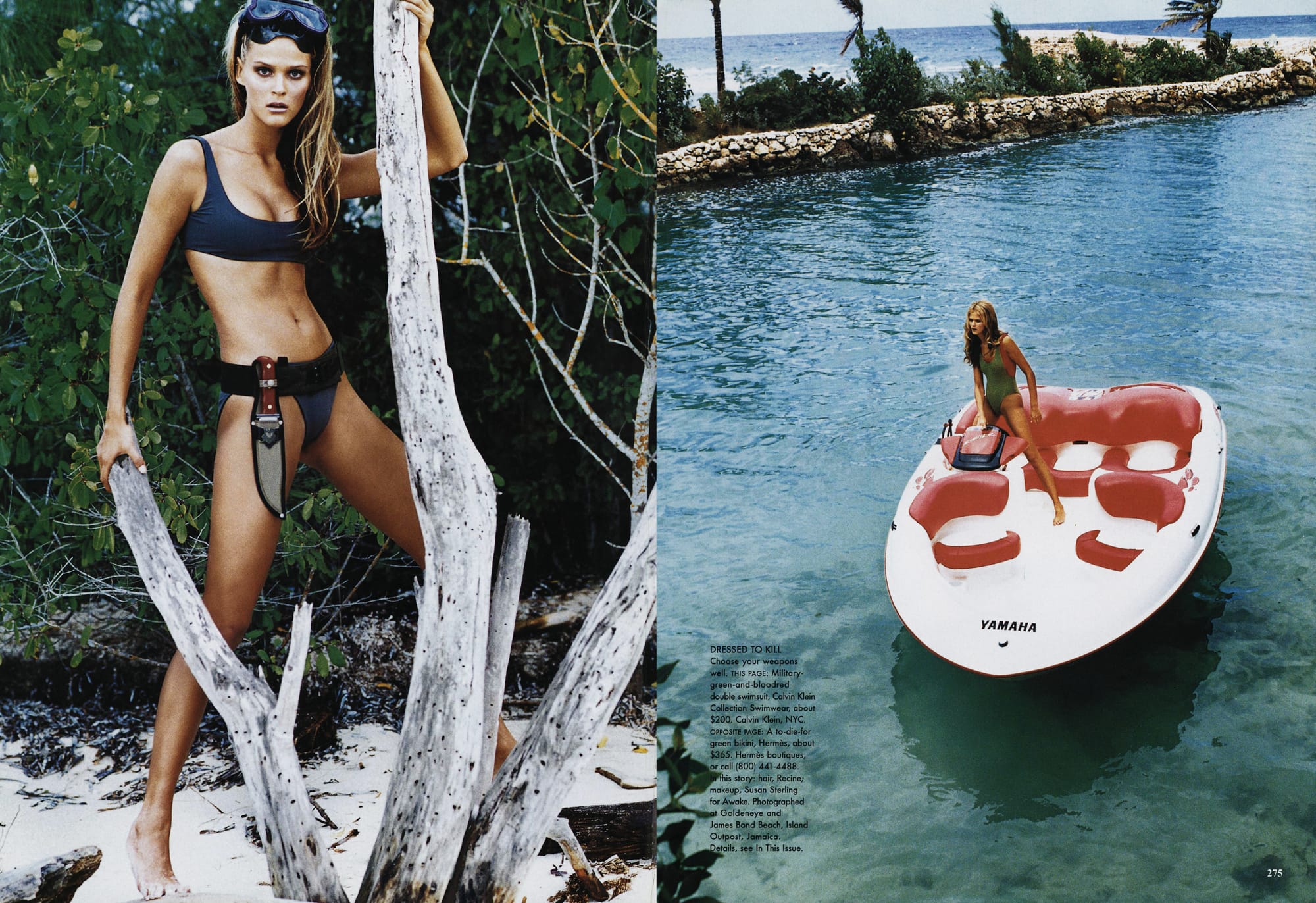 DRESSED TO KILL - Choose your weapons well. THIS PAGE: Military-green and blood-red double swimsuit, Calvin Klein Collection Swimwear, about $200. Calvin Klein, NYC. OPPOSITE PAGE: A to-die-for green bikini, Hermès, about $365. Hermès boutiques, or call (800) 441-4488. Photographed at Goldeneye and James Bond Beach, Island Outpost, Jamaica.