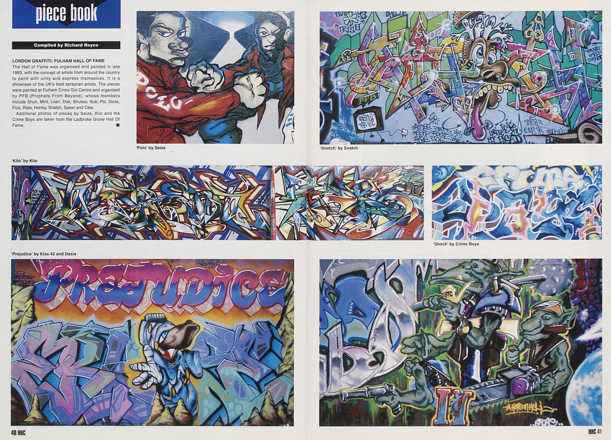 The Hall of Fame was organized and painted in late 1993, with the concept of artists from around the country to paint with unity and express themselves. It is a showcase of the UK's best spraycan artists. The pieces were painted at Fulham Cross Girl Centre and organized by PFB (Prophets From Beyond), whose members include Shun, Mint, Loan, Diet, Shutwo, Sub, Pic, Doze, Fiza, Rate, Honky, Snatch, Saker and Cike.