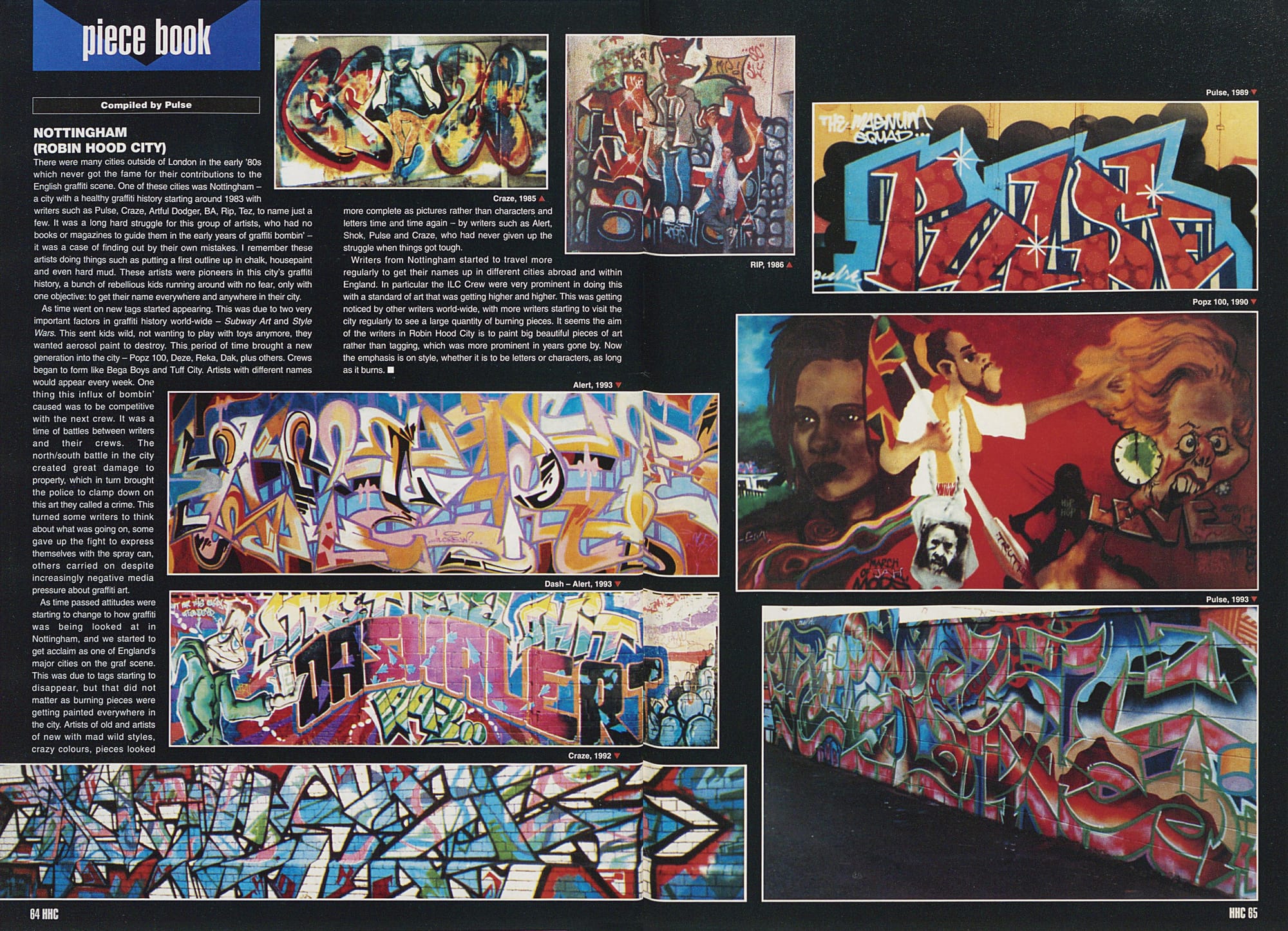 There were many cities outside of London in the early '80s which never got the fame for their contributions to the English graffiti scene. One of these cities was Nottingham - a city with a healthy graffiti history starting around 1983 with writers such as Pulse, Craze, Artful Dodger, BA, Rip, Tez, to name just a few. It was a long hard struggle for this group of artists, who had no books or magazines to guide them in the early years of graffiti bombin' - it was a case of finding out by their own mistakes. I remember these artists doing things such as putting a first outline up in chalk, housepaint and even hard mud. These artists were pioneers in this city's graffiti history, a bunch of rebellious kids running around with no fear, only with one objective: to get their name everywhere and anywhere in their city.