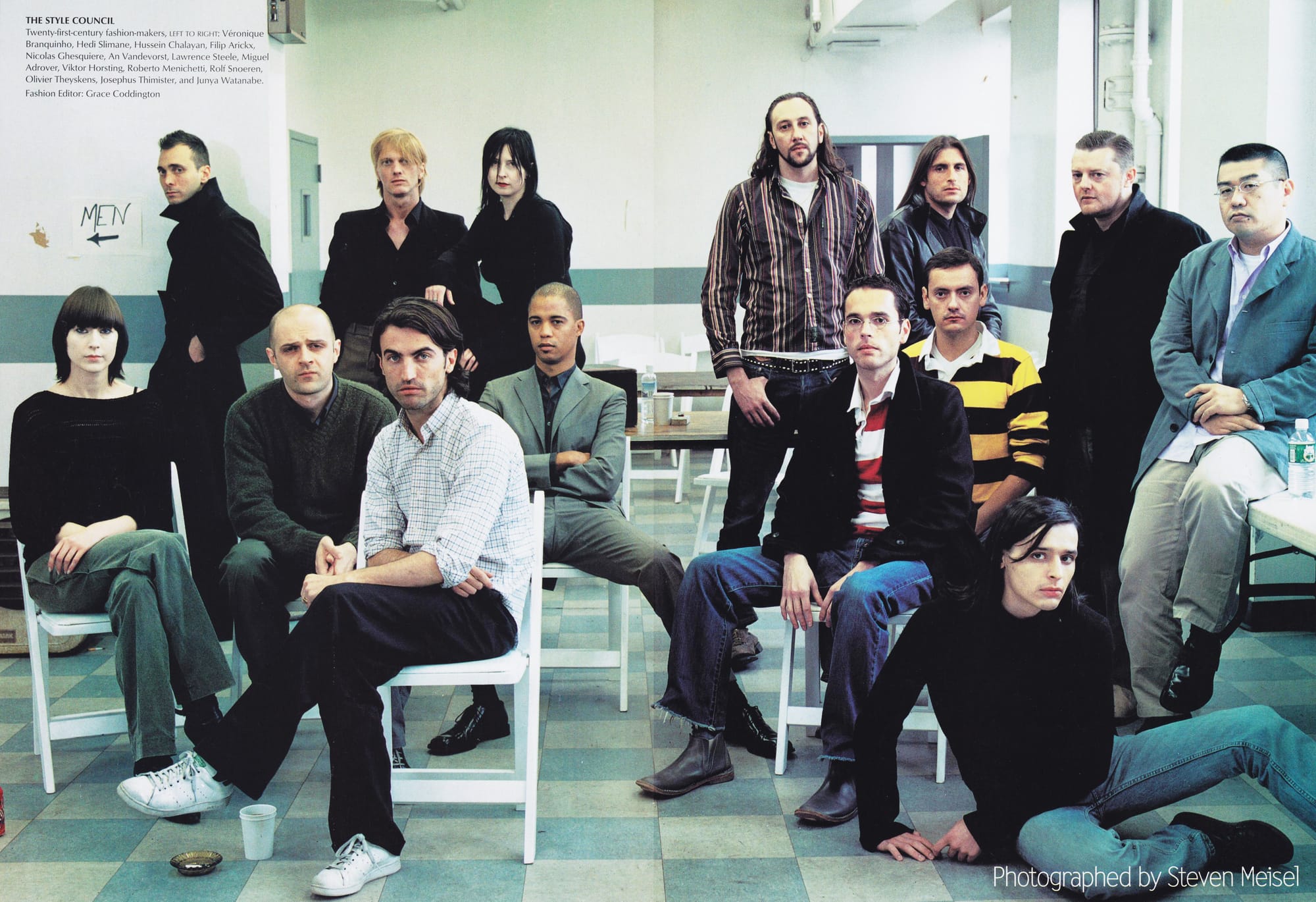 THE STYLE COUNCIL - Twenty-first-century fashion-makers, LEFT TO RIGHT: Véronique Branquinho, Hedi Slimane, Hussein Chalayan, Filip Arickx, Nicolas Ghesquiere, An Vandevorst, Lawrence Steele, Miguel Adrover, Viktor Horsting, Roberto Menichetti, Rolf Snoeren, Olivier Theyskens, Josephus Thimister, and Junya Watanabe.