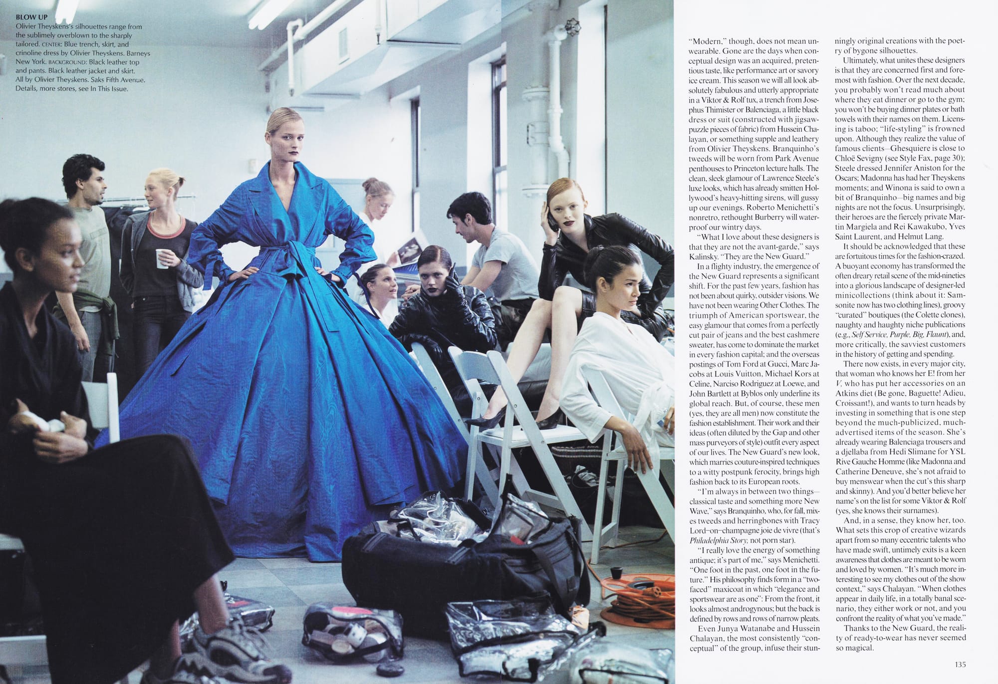 BLOWN UP - Olivier Theyskens's silhouettes range from the sublimely overblown to the sharply tailored. CENTER: Blue trench, skirt, and crinoline dress by Olivier Theyskens. Barneys New York. BACKGROUND: Black leather top and pants. Black leather jacket and skirt. All by Olivier Theyskens. Saks Fifth Avenue.