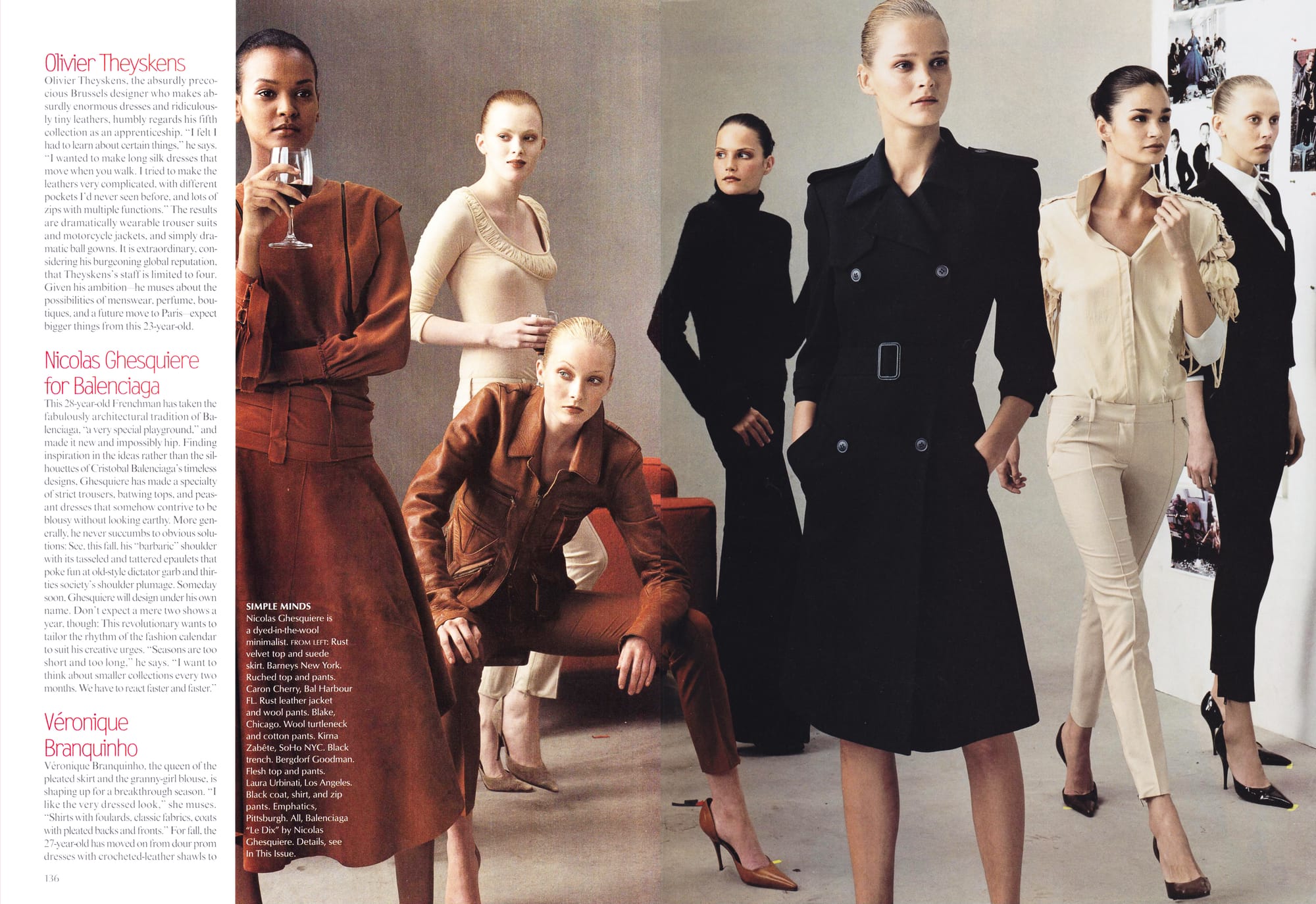 SIMPLE MINDS - Nicolas Ghesquiere is a dyed-in-the-wool minimalist. FROM LEFT: Rust velvet top and suede skirt. Barneys New York. Ruched top and pants. Caron Cherry, Bal Harbour FL. Rust leather jacket and wool pants. Blake, Chicago. Wool turtleneck and cotton pants. Kirna Zabête, SoHo NYC. Black trench. Bergdorf Goodman. Flesh top and pants. Laura Urbinati, Los Angeles. Black coat, shirt, and zip pants. Emphatics, Pittsburgh. All, Balenciaga "Le Dix" by Nicolas Ghesquiere.