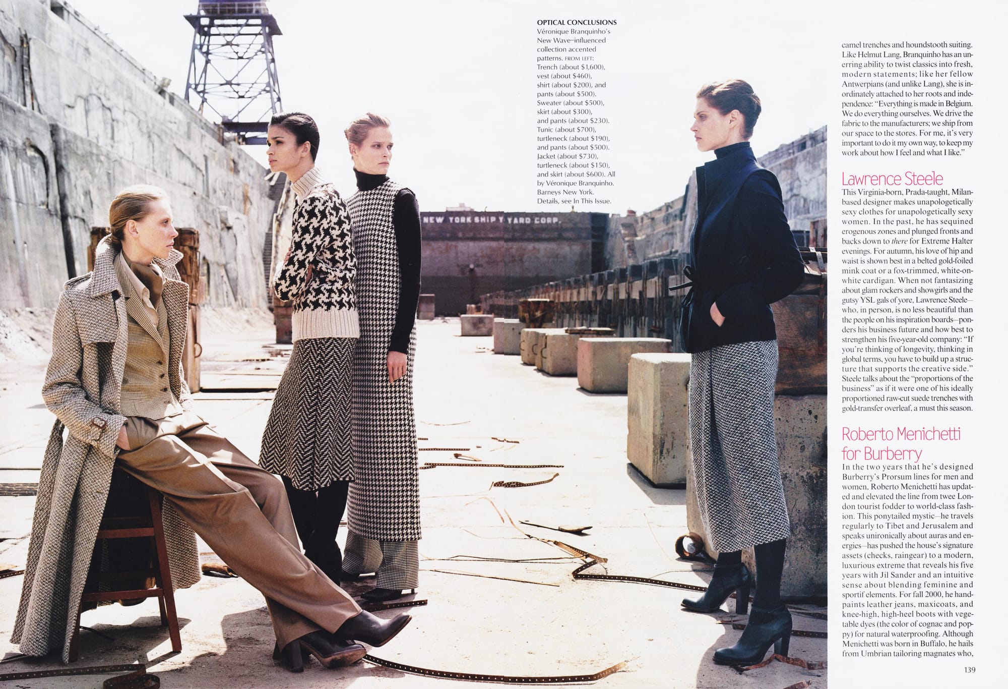 OPTICAL CONCLUSIONS - Véronique Branquinho's New Wave influenced collection accented patterns. FROM LEFT: Trench (about $1,600), vest (about $460), shirt (about $200), and pants (about $500). Sweater (about $500), skirt (about $300), and pants (about $230). Tunic (about $700), turtleneck (about $190), and pants (about $500). Jacket (about $730), turtleneck (about $150), and skirt (about $600). All by Véronique Branquinho. Barneys New York.
