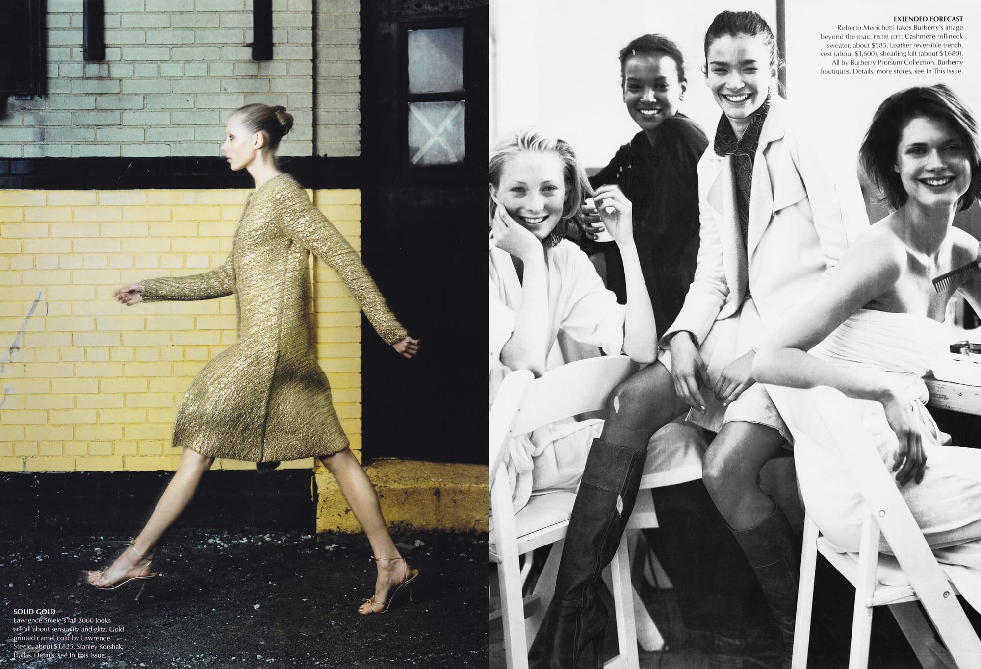 SOLID GOLD - Lawrence Steele’s Fall 2000 looks are all about sensuality and glitz. Gold printed camel coat by Lawrence Steele, about $1825. Stanley Korshak; Dallas.
