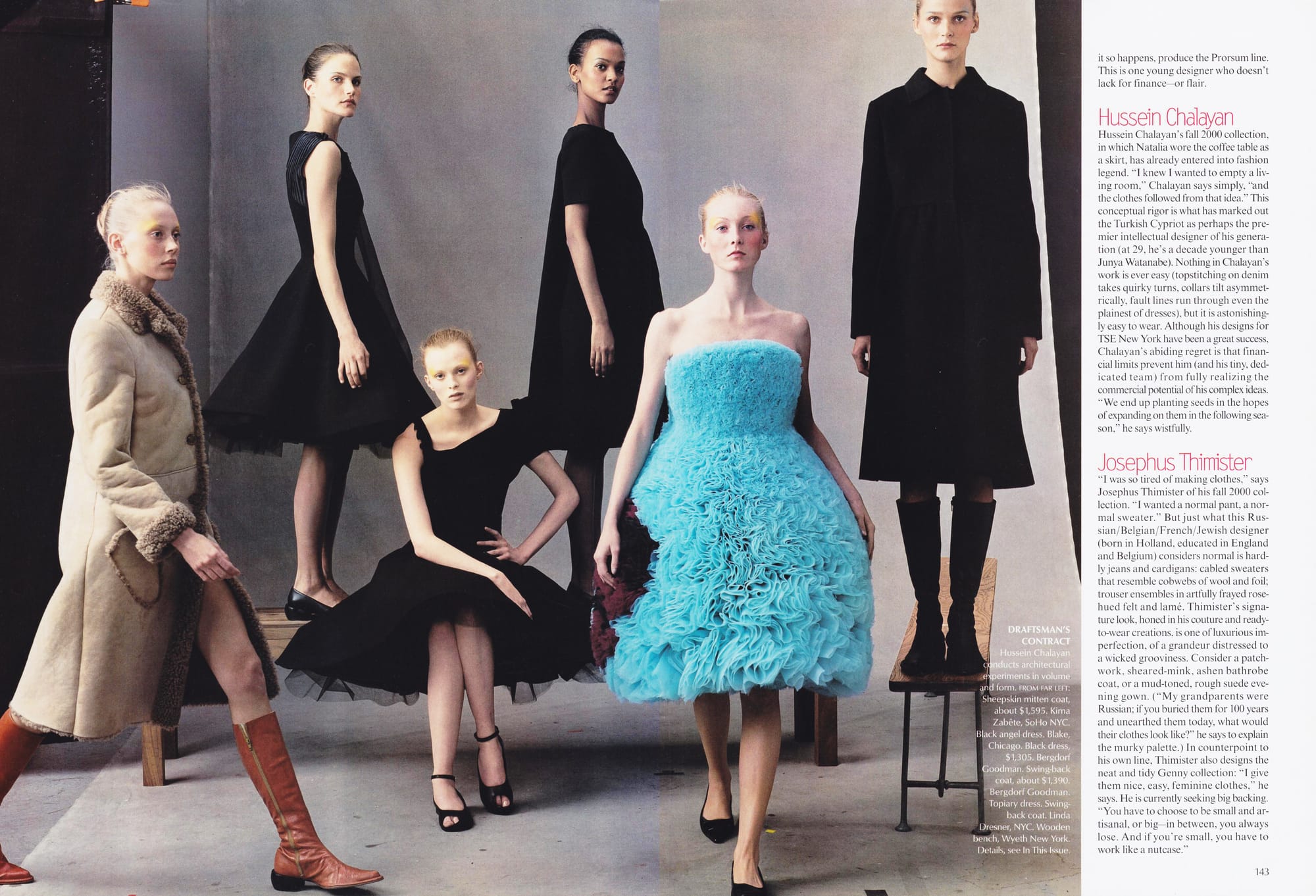 Hussein Chalayan - Hussein Chalayan's fall 2000 collection, in which Natalia wore the coffee table as a skirt, has already entered into fashion legend. "I knew I wanted to empty a living room," Chalayan says simply, "and the clothes followed from that idea." This conceptual rigor is what has marked out the Turkish Cypriot as perhaps the premier intellectual designer of his generation (at 29, he's a decade younger than Junya Watanabe. Nothing in Chalayan's work is ever easy (topstitching on denim takes quirky turns, collars tilt asymmetrically, fault lines run through even the plainest of dresses), but it is astonishingly easy to wear. Although his designs for TSE New York have been a great success, Chalayan's abiding regret is that financial limits prevent him (and his tiny, dedicated team from fully realizing the commercial potential of his complex ideas. "We end up planting seeds in the hopes of expanding on them in the following season," he says wistfully.