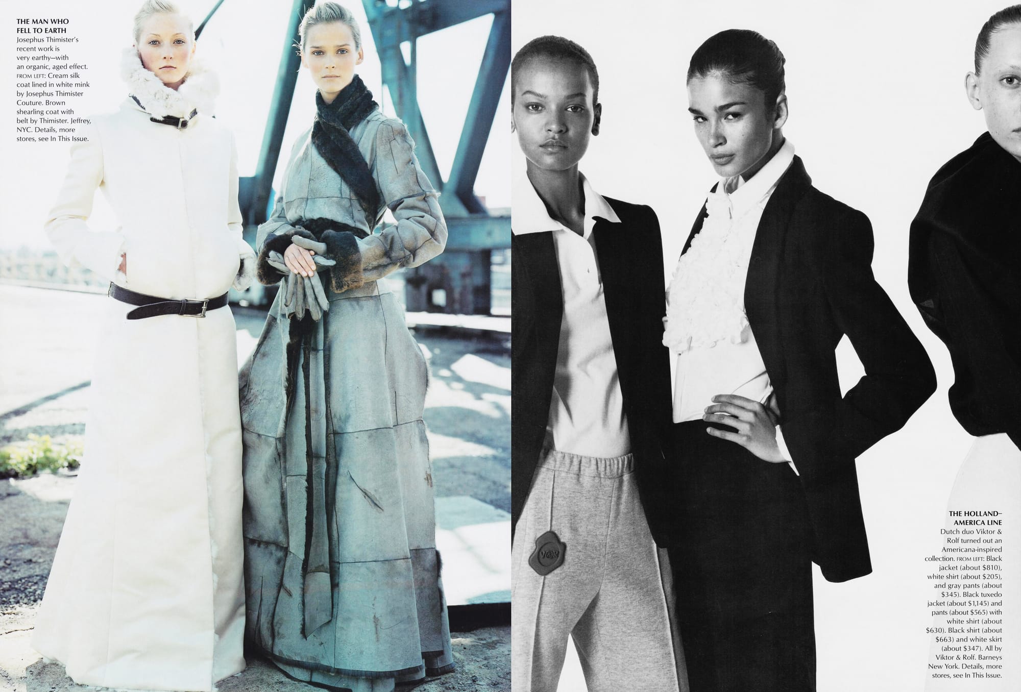 Viktor & Rolf - Viktor Horsting and Rolf Snoeren, dry-witted Dutchmen with shoe-polish hair and geeky specs, turned haute couture on its tête in the late nineties with their Pierrot-collared ensembles and layered Swarovski-crystal gowns. Now they've reinvented ready-to-wear by offering, in their debut collection, the most carefully edited capsule wardrobe a stylish gal could ever hope for: one graphic print, one tuxedo, one suit, one coat, a little denim, a stripy shirt, some sports gear, a simple dress or two. "For the couture," explains Viktor, "we don't really think about the customer. The clothing is like an autonomous thing." Which is why this design team's primary client to date has been a museum in Groningen, and why the new line is so unexpectedly delightful.