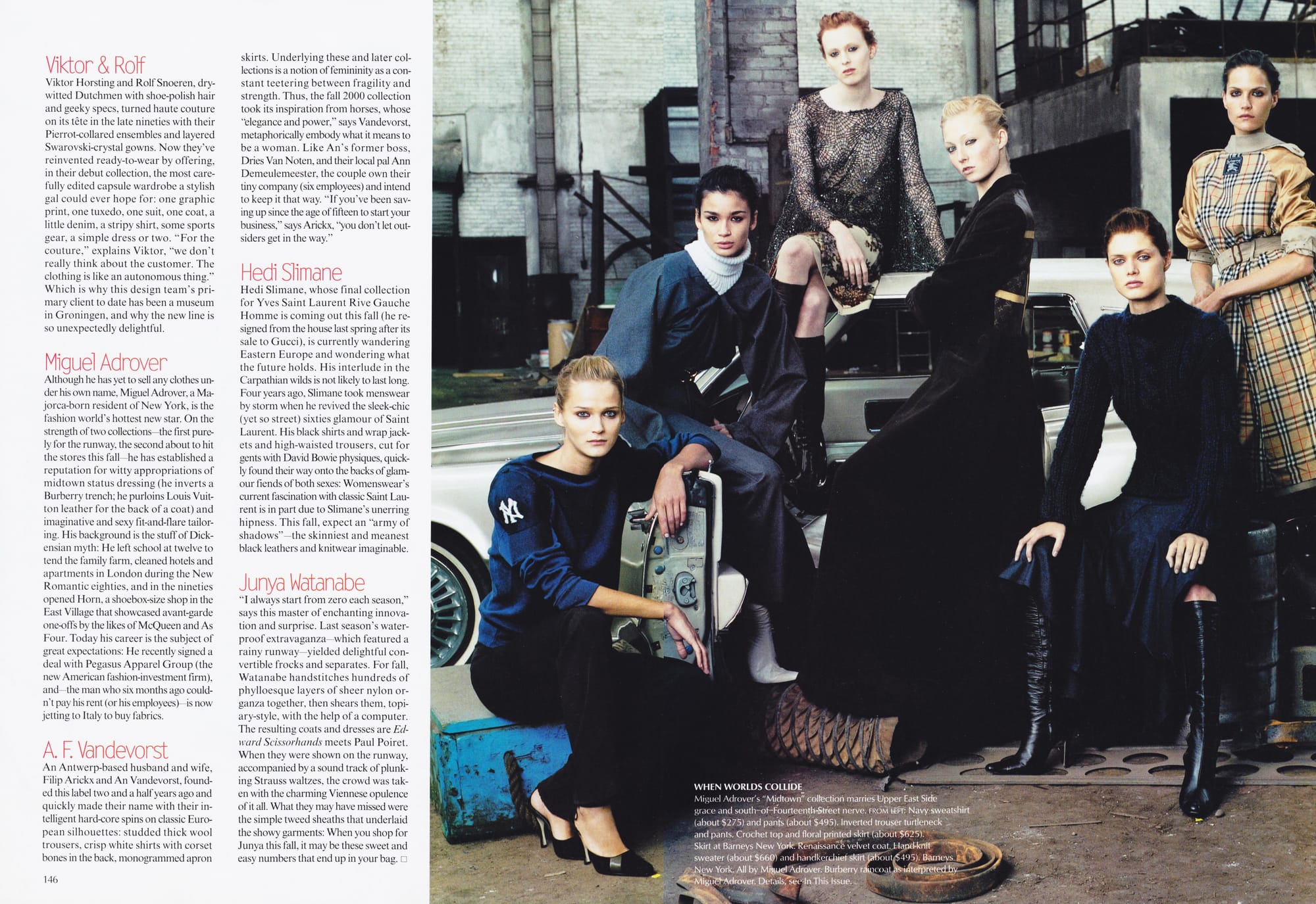 Miguel Adrover - Although he has yet to sell any clothes under his own name, Miguel Adrover, a Majorca-born resident of New York. is the fashion world's hottest new star. On the strength of two collectionsthe first purely for the runway, the second about to hit the stores this fall he has established a reputation for witty appropriations of midtown status dressing (he inverts a Burberry trench; he purloins Louis Vuitton leather for the back of a coat) and imaginative and sexy fit-and-flare tailor-ing. His background is the stuff of Dickensian myth: He left school at twelve to tend the family farm, cleaned hotels and apartments in London during the New Romantic eighties, and in the nineties opened Horn, a shoebox-size shop in the East Village that showcased avant-garde one-offs by the likes of McQueen and As Four. Today his career is the subject of great expectations: He recently signed a deal with Pegasus Apparel Group (the new American fashion-investment firm). and the man who six months ago couldn't pay his rent (or his employees) is now jetting to Italy to buy fabrics.